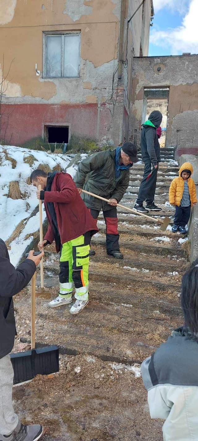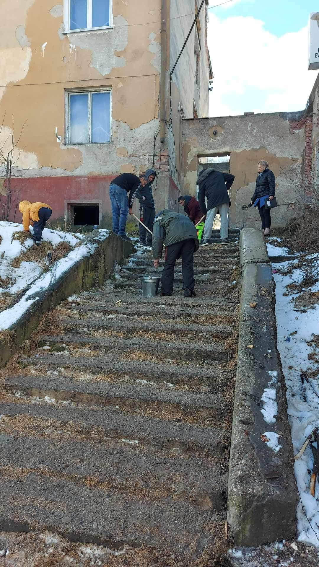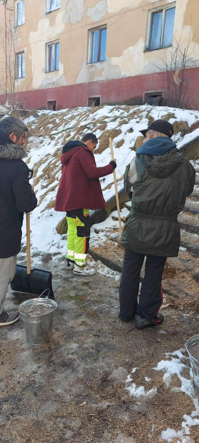 Ďalšiu aktivitu dnes zorganizovala naša pracovníčka na bývanie spolu s asistentkou rozvojového tímu. Keďže chodia naše pracovníčky pravidelne do terénu, všimli si že schody pred bytovým domom obyvateľom sú zľadovatené, a práve preto sa rozhodli túto situáciu riešiť. Koordinátor Tibor Molnár poskytol pracovníčkam náradie, štrk a posypovú soľ, za čo mu veľmi pekne ďakujeme. Všetko bolo pripravené a obyvatelia bytového domu boli zapojení do aktivity tým, že si schody vyčistili a posypali štrkom a soľou. Môžme povedať , že všetci zúčastnení boli ochotní, nápomocní a boli radi , že sa táto aktivita uskutočnila. S pracovníčkou na bývanie sa už dohadovali na ďalších aktivitách, ktoré budú zamerané na zveľaďovanie ich príbytkov a okolia.