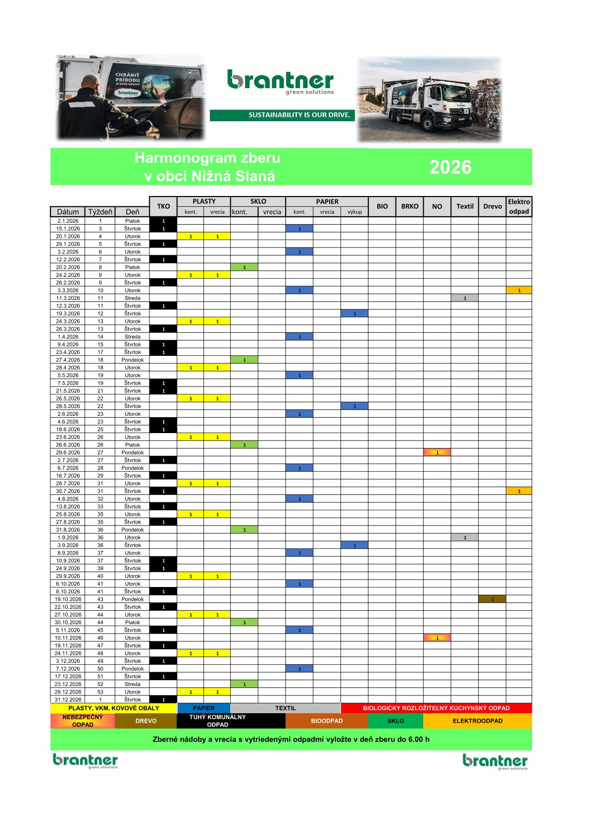 Obec Nižná Slaná oznamuje občanom harmonogram odvozu odpadu na rok 2026.