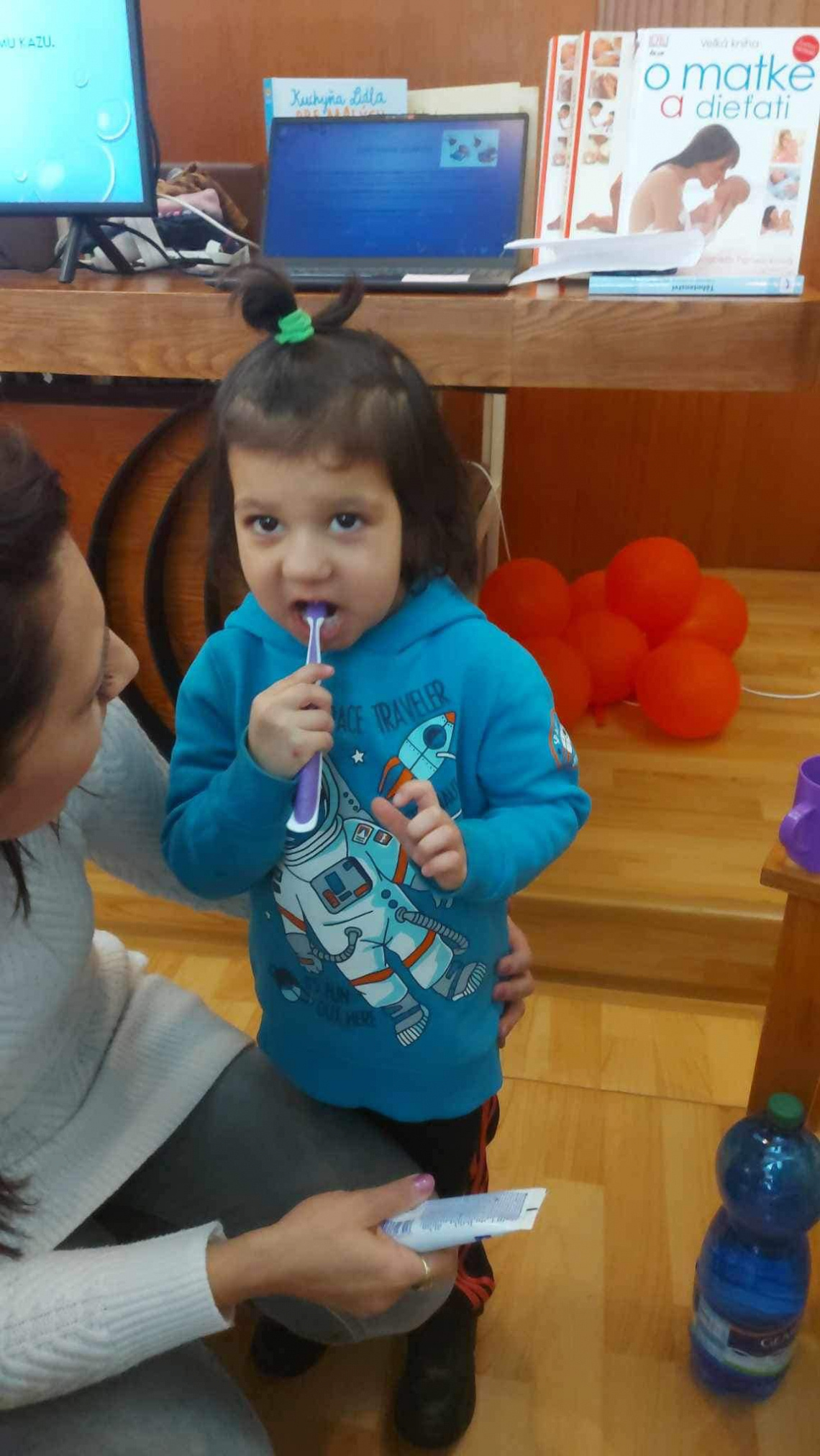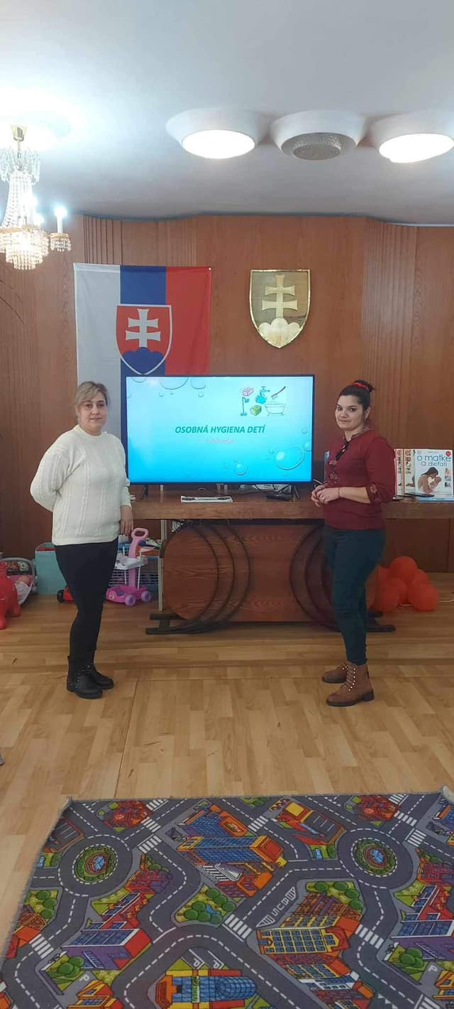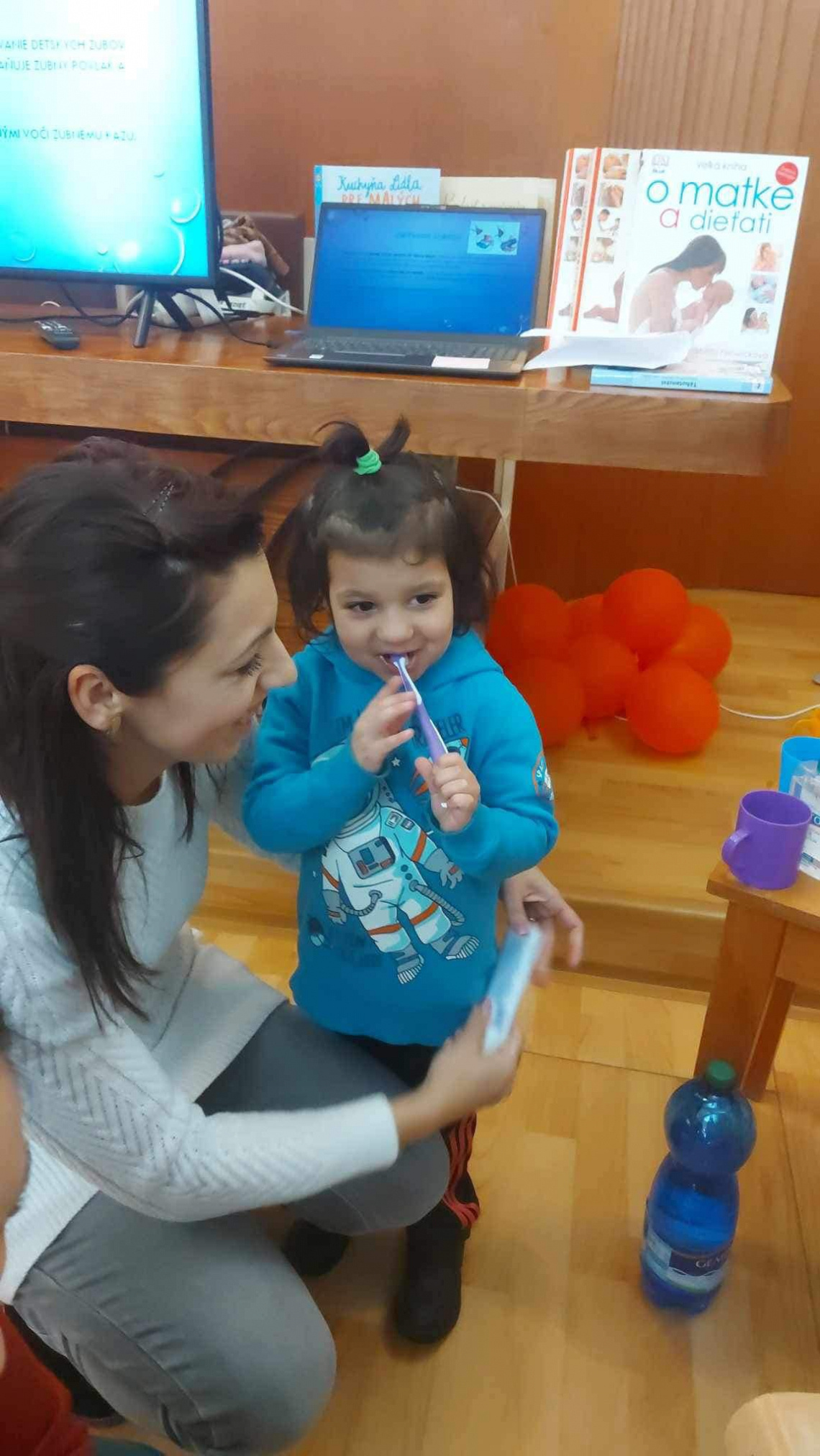 Témou dnešného "mami klubu", ktorý sme poňali trochu viac ako vzdelávaciu aktivitu, bola hygiena. Zamerali sme sa na základné hygienické návyky u detí ako je napríklad umývanie rúk a zúbkov. Prostedníctvom prezentácie sme mamičky oboznámili o základoch hygieny, ktoré by mali dodržiavať vo svojej domacnosti a detičkám sme pustili kreslené video, kde sa dozvedeli všetko , čo by mali vedieť vrámci hygienických základov. Každé dieťatko dostalo svoj hygienický balíček, z ktorého malo veľkú radosť a hneď vyskúšali svoju novú zubnú kefku a pastu.